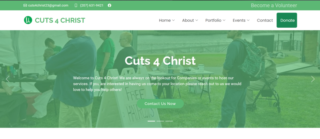 A nonprofit website for Cuts4Christ, an organization providing free haircuts and hygiene essentials to those in need.