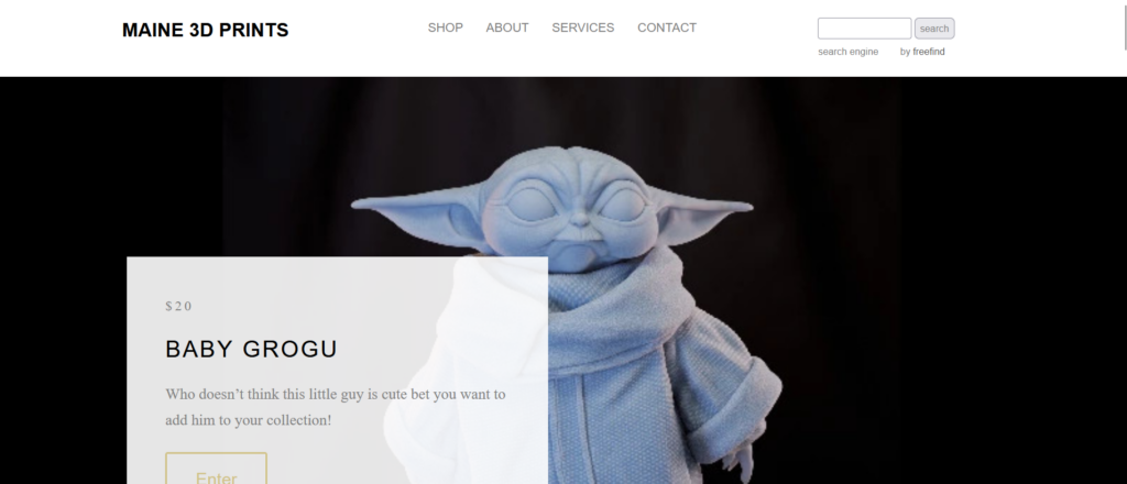 A demo website concept for a potential 3D printing business, Maine 3D Prints. This project explores branding, layout, and functionality for showcasing custom print services and products.