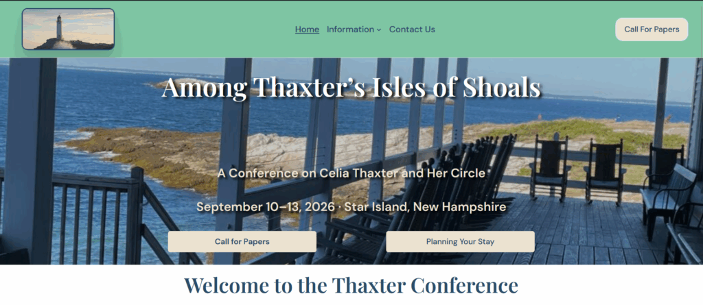 AmongThaxtersIsles.org is the official website for the 2026 Thaxter Conference, a scholarly gathering focused on poet Celia Thaxter and her circle. The site provides details on accommodations, travel, and the call for papers, all set against the serene backdrop of Star Island, New Hampshire.