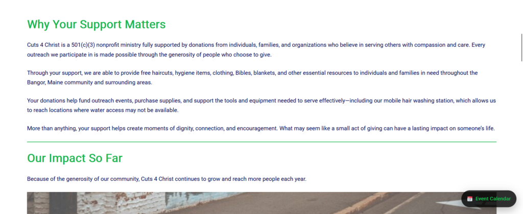 For a ministry like Cuts 4 Christ, the website needs to do more than exist—it needs to guide people quickly and clearly toward action. Whether someone wants to attend an outreach, become a volunteer, donate supplies, or learn more about the mission, the path should feel simple and welcoming.