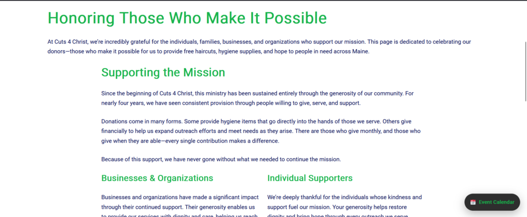 The finished website better reflects the heart of the ministry while making it easier for the community to engage. With a more accessible layout and clearer calls to action, the site now supports Cuts 4 Christ in a stronger and more practical way.